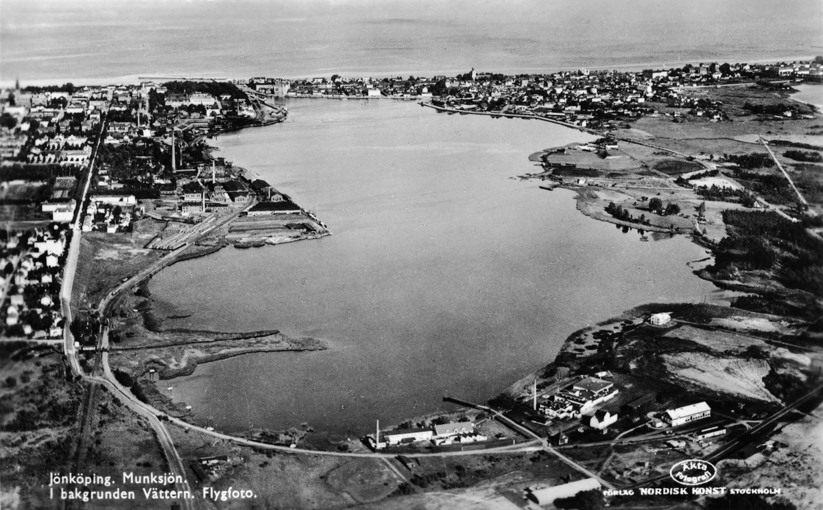 Flygfoto över Munksjön och delar av Jönköping, i bakgrunden syns Vättern.