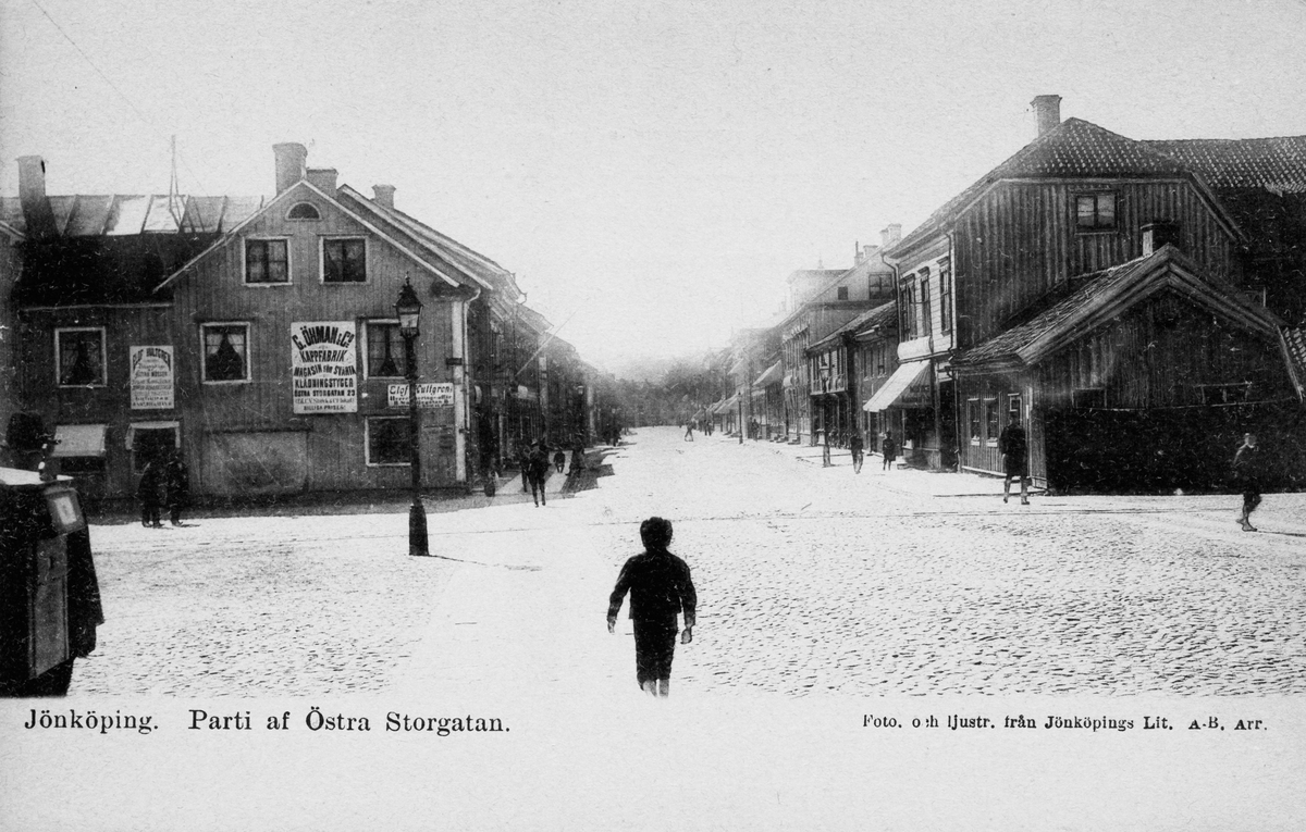 Östra Storgatan i Jönköping. I huset till vänster ligger enligt reklamskylten "G. Öhman & Co Kappfabrik för svarta klädningstyger Östra Storgatan 23 Billiga priser".