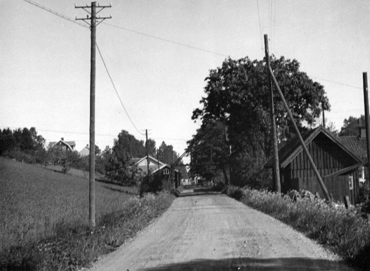 Landsvägen mellan Tenhult och Ödestugu. Bilden är tagen mot norr med Tenhult i bakgrunden. Till höger banvaktsstugan och därintill, skymd av träd, linbanans ändstation. Man ser bärlinan och träskyddet över vägen.