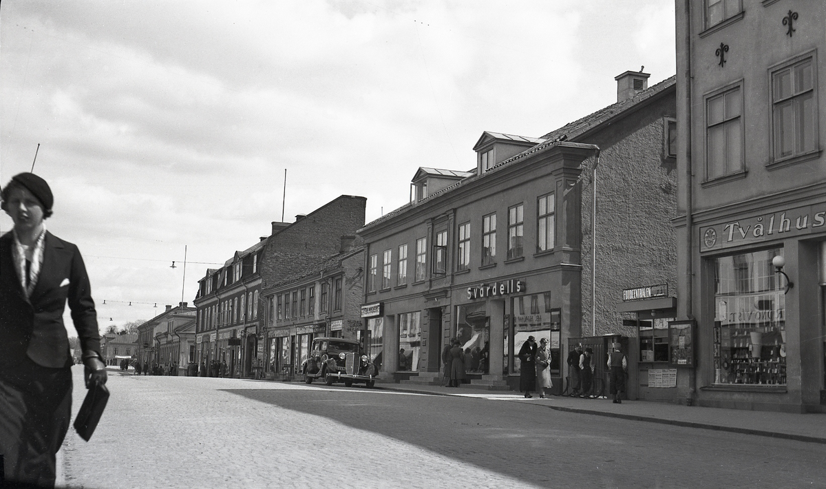 Vy längs Storgatan i Växjö österut mot stortorget. Man ser bl a affären Tvålhuset och Svärdells herrekipering i kvarteret Blenda.