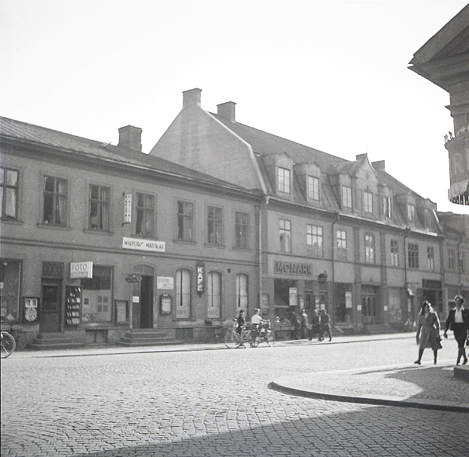Vy utmed Storgatan (kv. Stormen) med bl a Foto-Centralen och ingången till Vigfors matsalar, följt av Monarks cykelaffär.