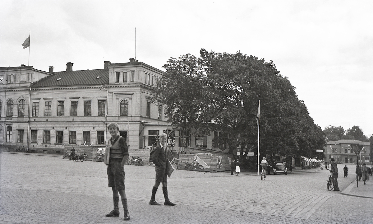 Några glada tidningspojkar framför stadshotellet i Växjö, i hörnet mot Kungsgatan.