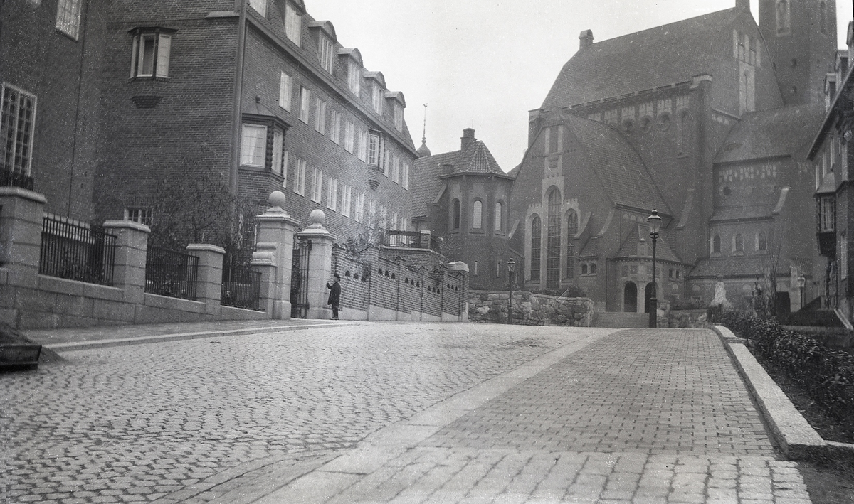 Bostadshus och kyrka i nationalromantisk stil. En pojke står avvaktande vid en grind.