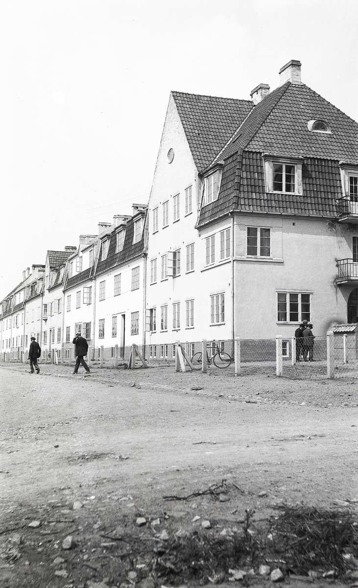 I förgrunden ett större reveterat flerfamiljshus, följt av flera liknande fastigheter längs en nyanlagd gata.