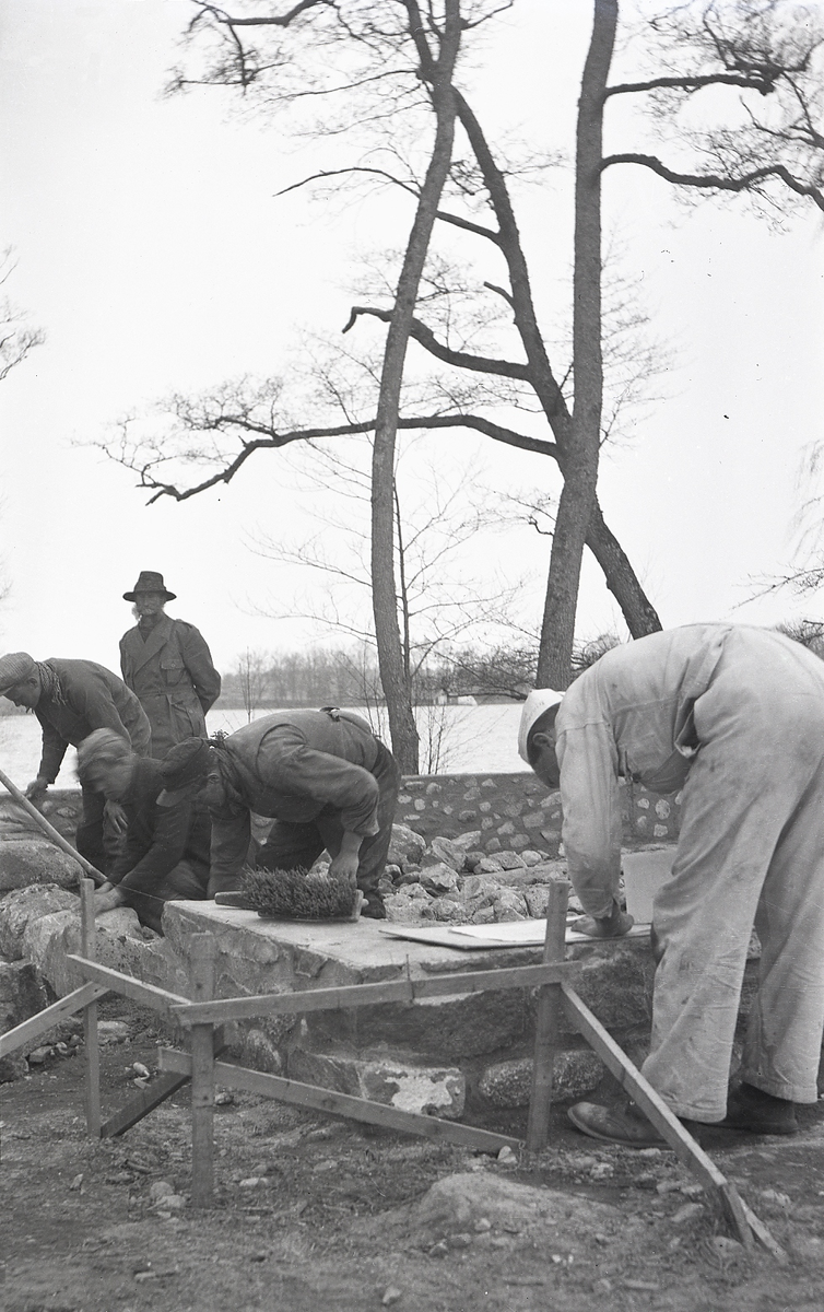 Några mannar är fullt sysselsatta med grundmuren.