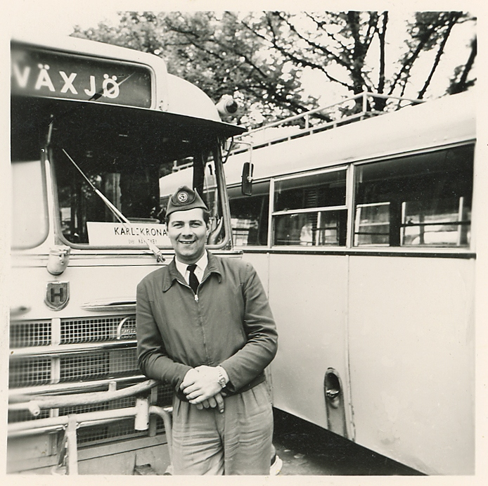 En glad chaufför i jacka och båtmössa står vid sidan av en SJ-buss, trol. i närheten av järnvägsstationen, Växjö.