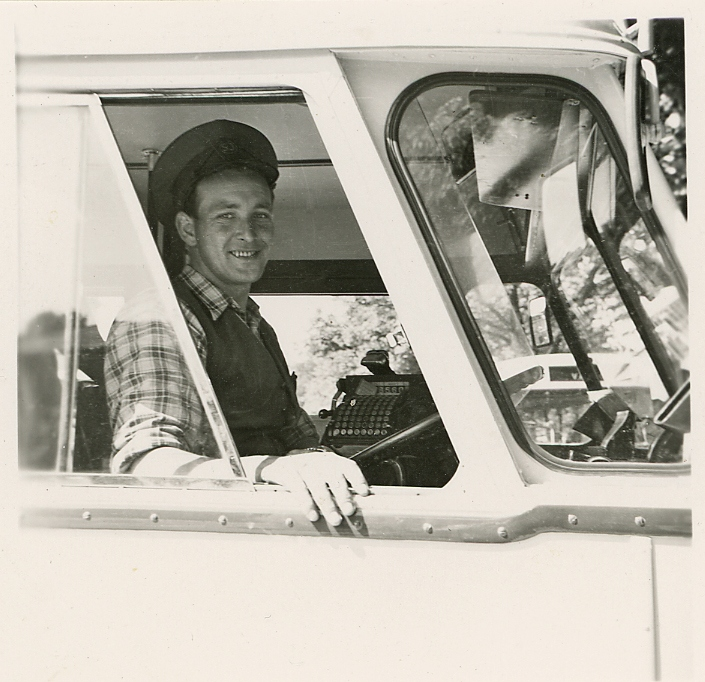 En glad chaufför i rutig skjorta, väst och skärmmössa tittar ut från en buss, trol. i närheten av järnvägsstationen, Växjö.