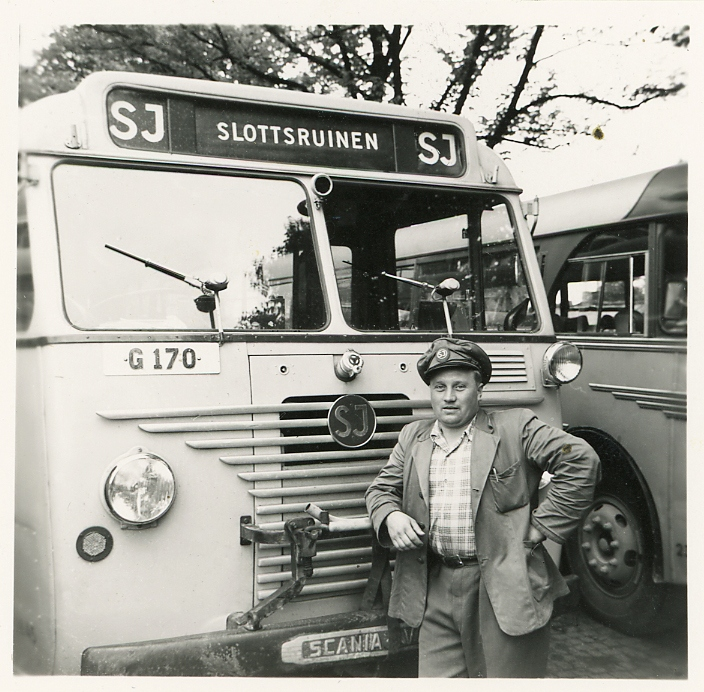 En chaufför i rutig skjorta, kavaj och skärmmössa står invid en SJ-buss, trol. på busstorget/järnvägsplan vid järnvägsstationen, Växjö.