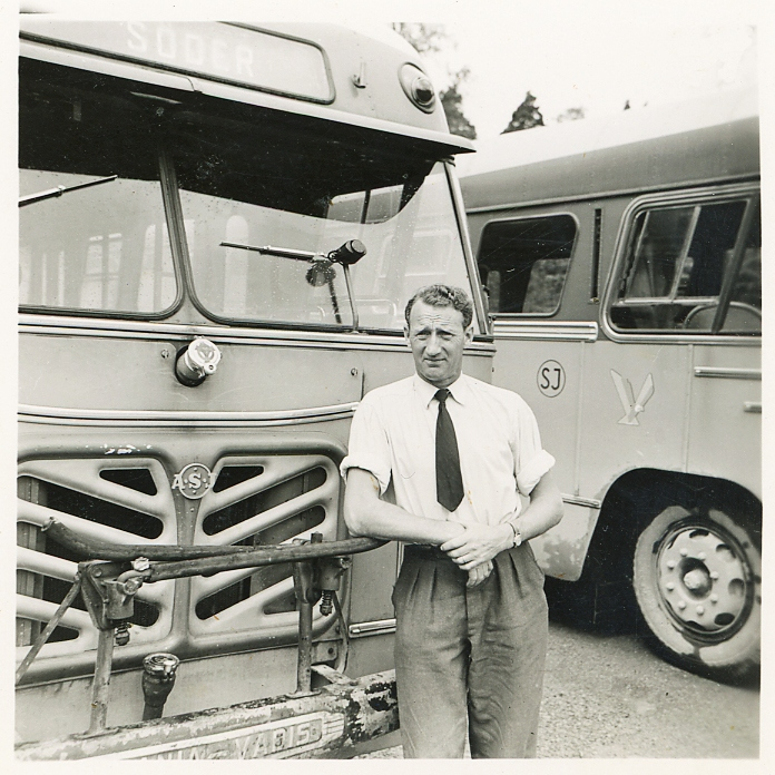 En chaufför i i skjortärmarna poserar framför en stadsbuss, trol. på järnvägsplan/busstorget i Växjö.