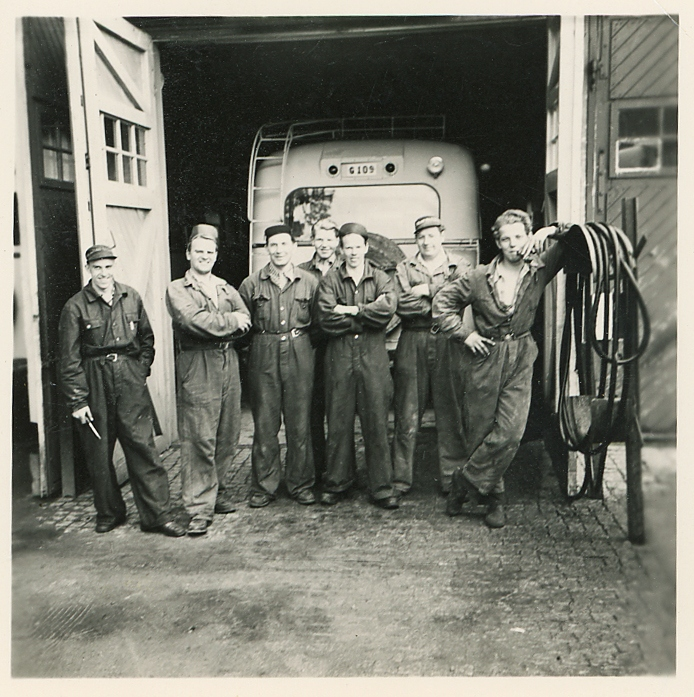 Personalen vid SJ:s bussgarage, Norra Järnvägsgatan i Växjö. har ställt upp sig för fotografering. Fr. v. : Lennart Johansson, Kambring, Rune Karlsson, Allan Lindström ("Tjo"), Norlin, Bertilsson och Frisk.
