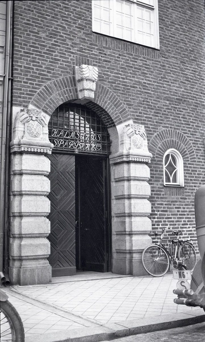 Titel: En av ingångarna till Halmstads Sparbank, vid Stortorget i Halmstad. Huset uppfördes i rött tegel och sandsten 1912-14, efter ritningar av arkitekterna Ivar Tengbom och Ernst Torulf.