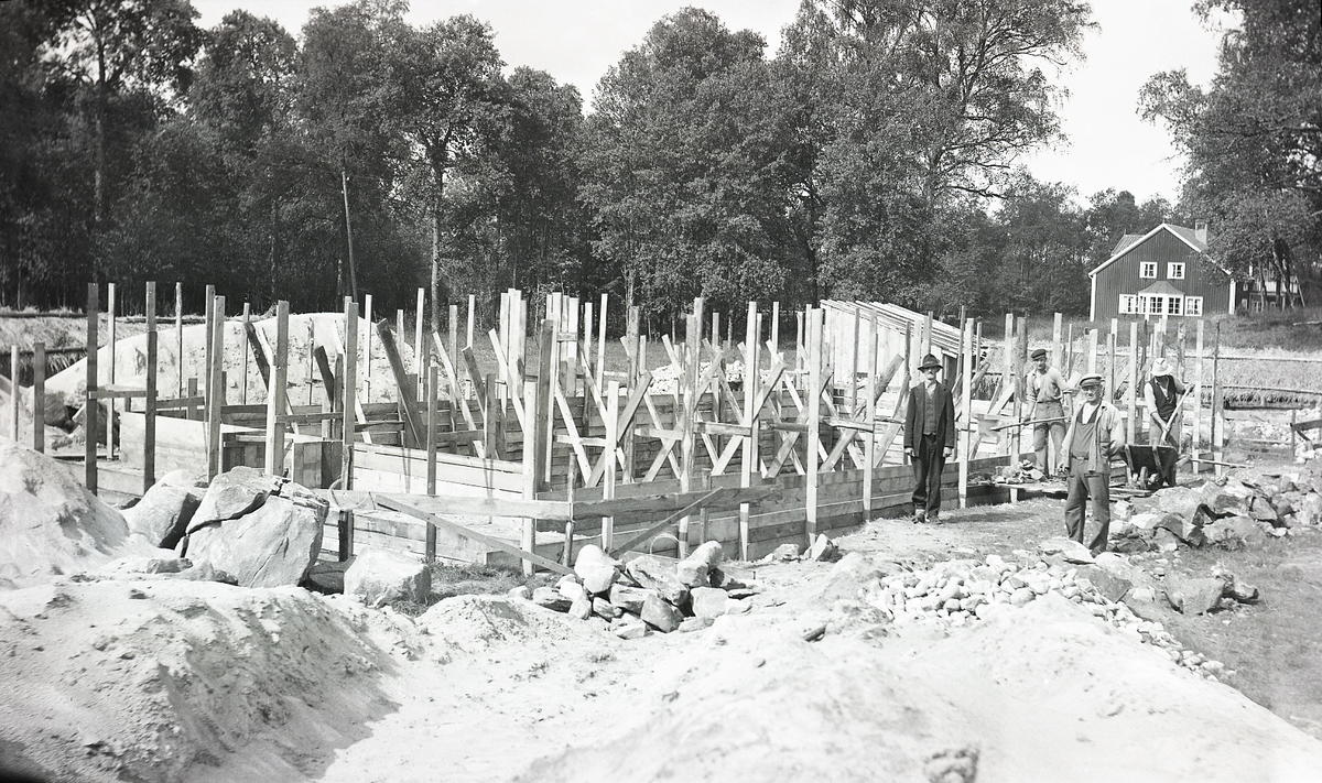 Titel: Per Henrik Lings födelsehem, den gamla prästgården i Södra Ljunga, efter nedrivning och flyttning. Man håller på att uppföra den nya s.k. Linggården, så som den kan ha sett ut 1768, då den ursprungliga prästgården byggdes.