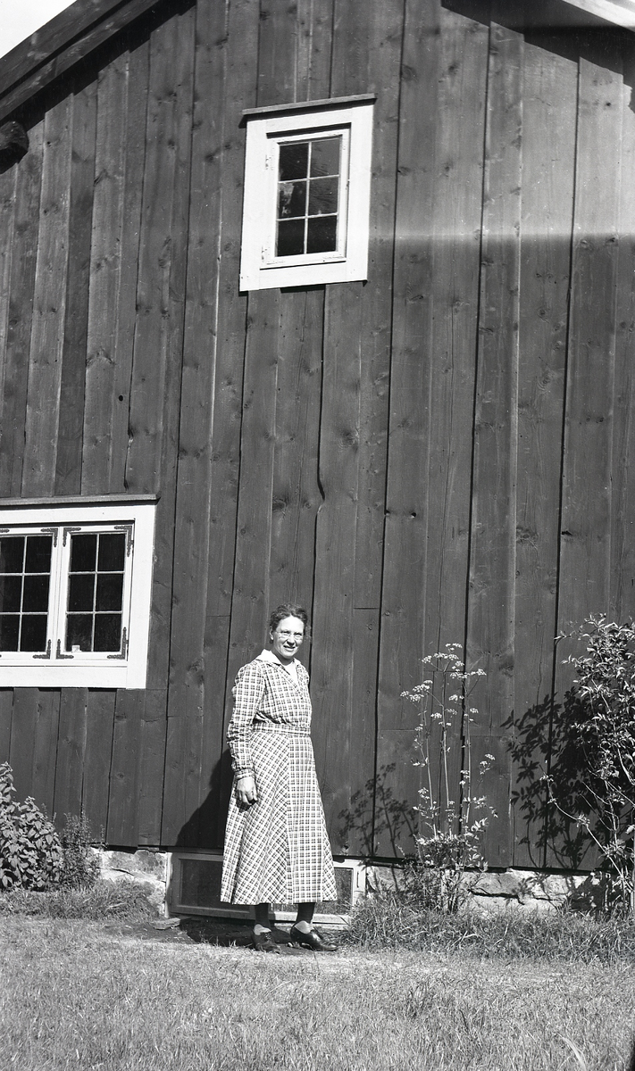 En medelålders kvinna i rutig klänning poserar vid en blomsterrabatt utanför huset.