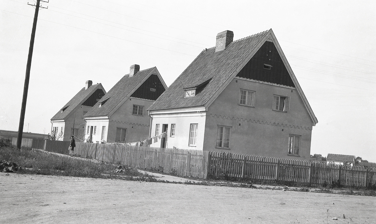 Några nybyggda "kedjehus" (småvillor) med trädgård längs den nyanlagda Tunnbindaregatan (?), i utkanten av Lund,