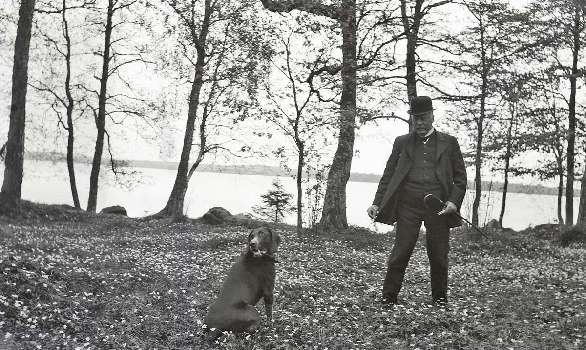 Evedal. En medelålders man (professor Ewert Wrangel?) i kostym med väst m.m. med sin hund bland vitsipporna. I bakgrunden skymtar Helgasjön.