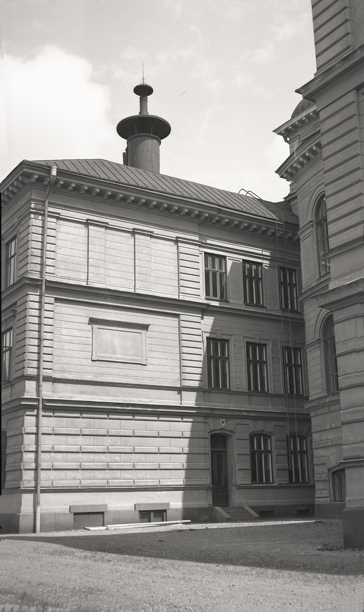 Växjö högre allmänna läroverk, västra fasaden med aula och gymnastiksal, mot dåv. Parkgatan.