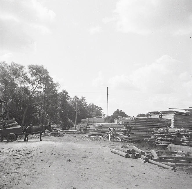 Trol. bakgården. Man ser en häst med kärra och diverse brädstaplar m.m..