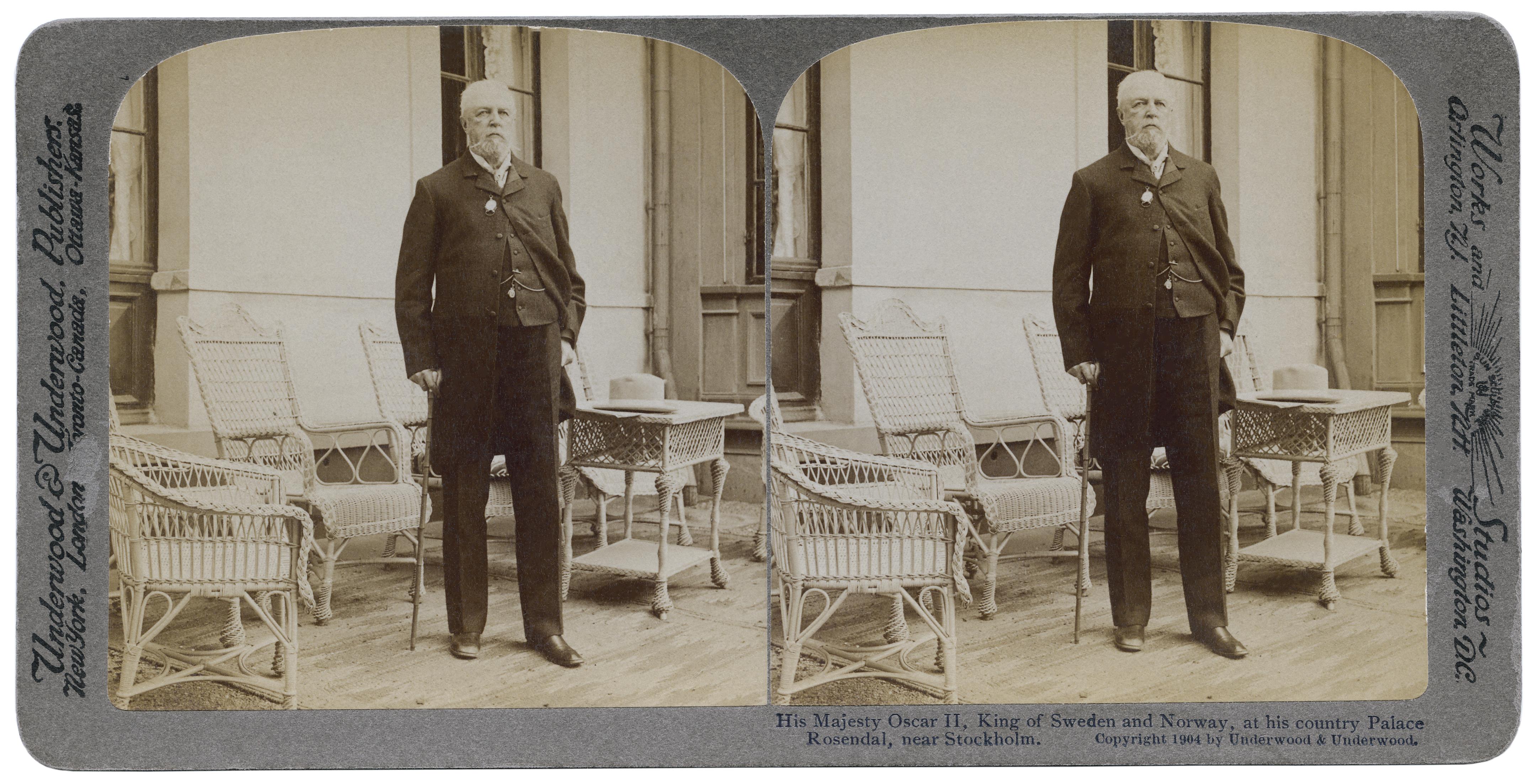 "Hans majestät Oscar II, kung av Sverige och Norge, vid sitt lantslott Rosendal, nära Stockholm." Stereofotografi. Underwood & Underwood Publishers.
