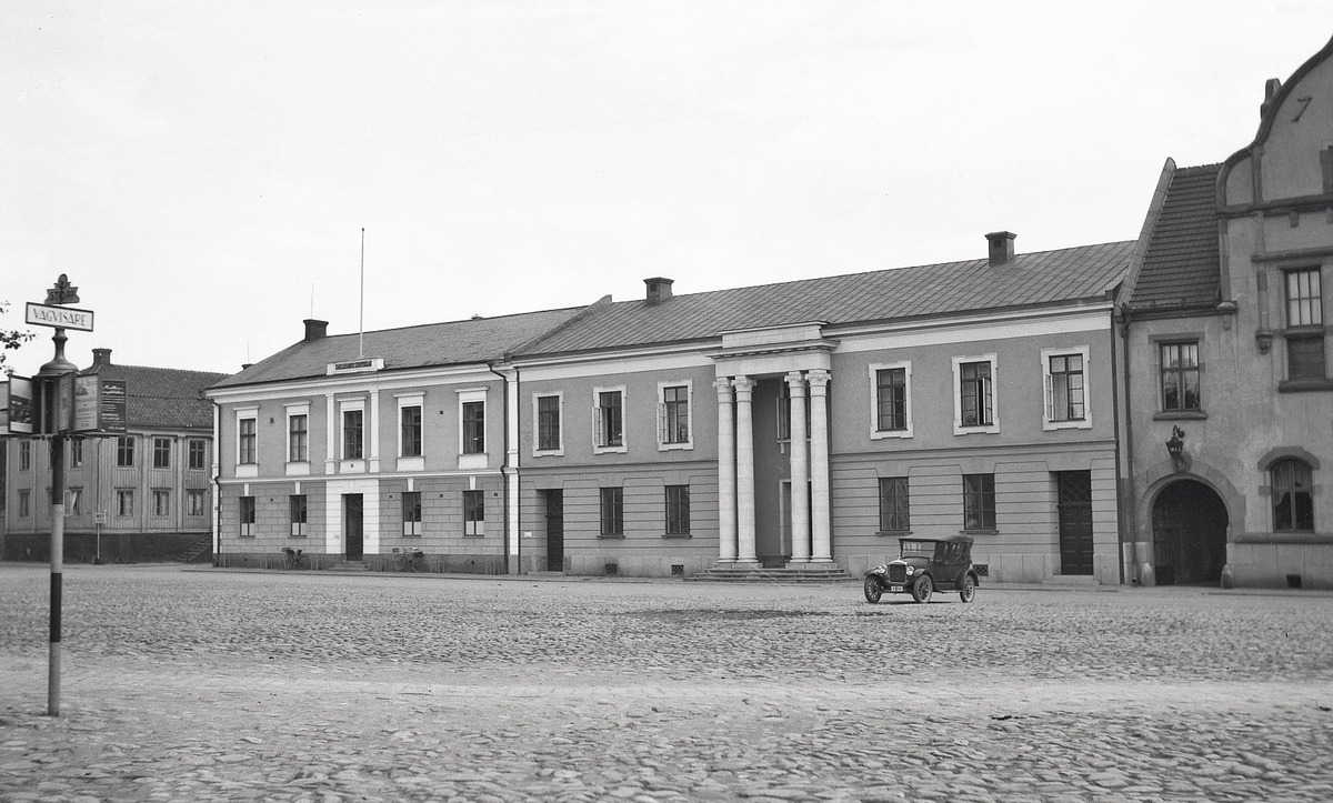Dåv. stadsbiblioteket, den nybyggda föreläsningssalen och rådhuset (med ingång till poliskontoret) i Karlshamn, längs Rådhusgatan.