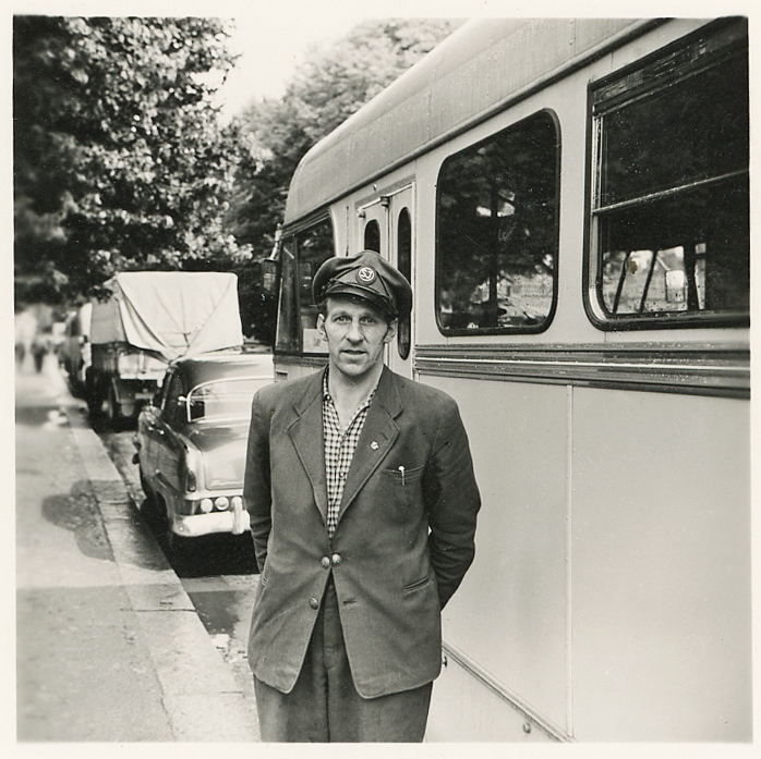 En busschaufför i rutig skjorta, kavaj och skärmmössa står utanför sin buss, trol. någonstans i närheten av