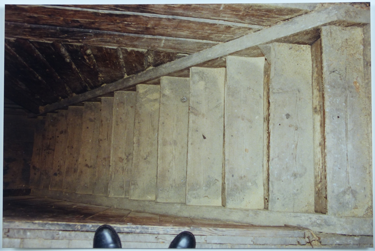 Träsliperiet före renovering. Trappa mellan receptionstak och vind.