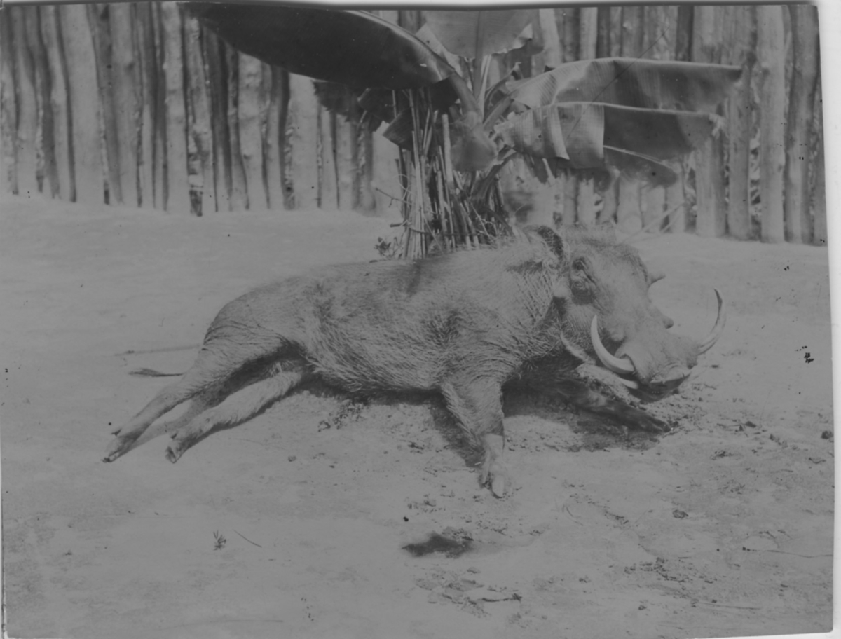 'Vårtsvin, liggande på marken framför trähägnad. :: :: Text på baksidan ''Vild galt, Luena, april 1903.'''