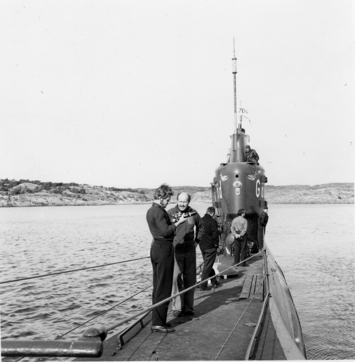 Män på ubåt. En officerare i tornet, civilklädda män på däck, en med kamera. Flagga med "700".