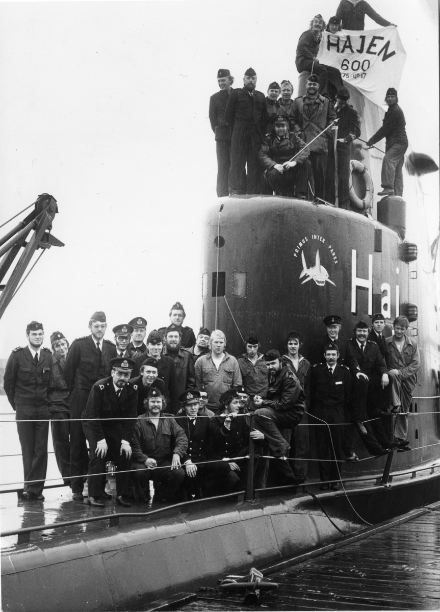Ubåten Hajen med besättning uppställd på däck och i tornet. Flagga med bland annat "600".