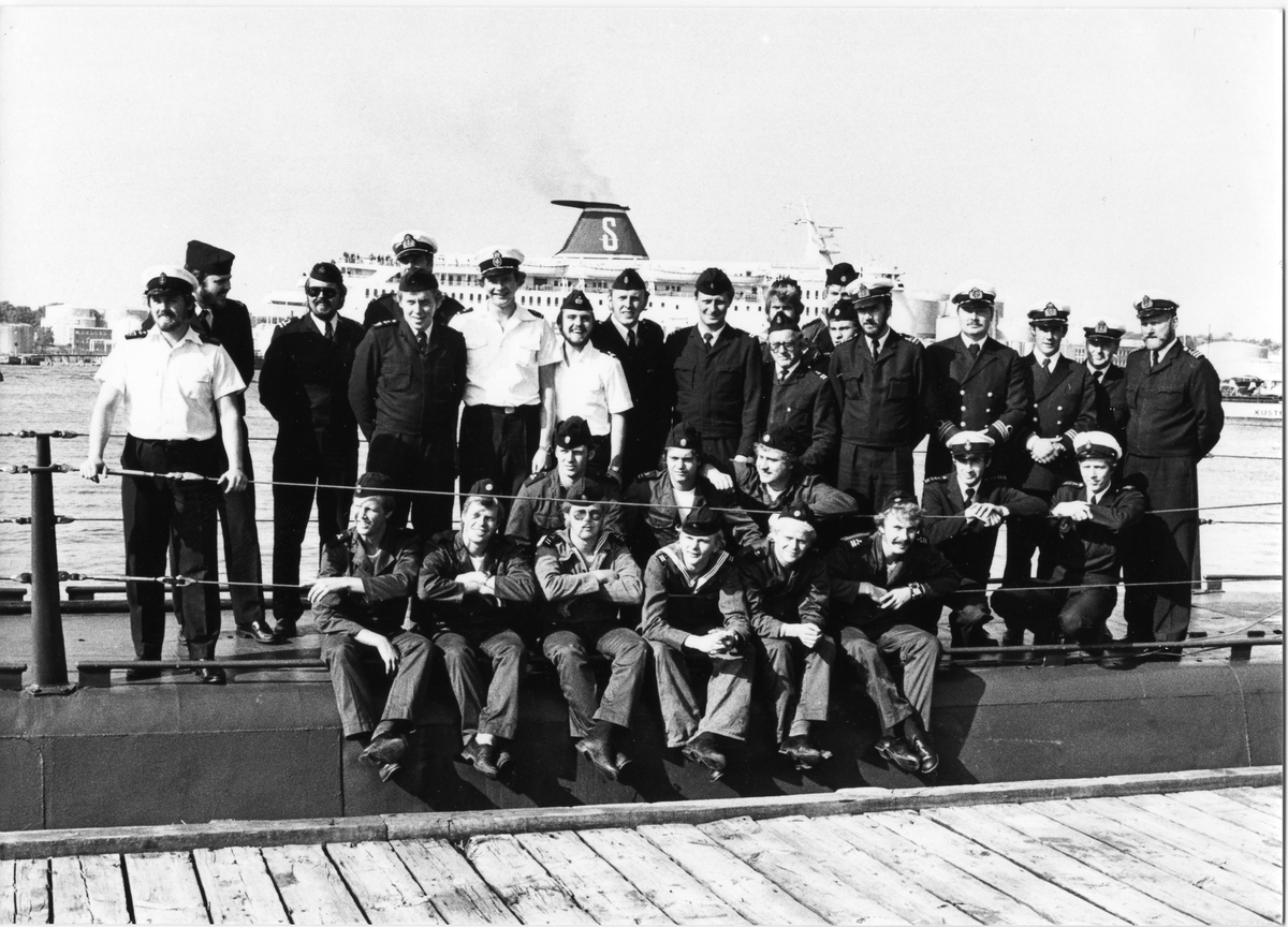 Besättning uppställd på däck intill kaj. Stena Line färja i bakgrunden. Delvis samma besättning som D 15159:4.
