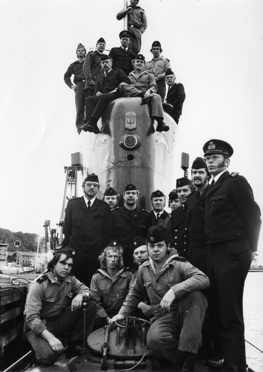 Ubåten Makrillen med delar av besättningen på däck och på tornet. En målad makrill syns på tornet.