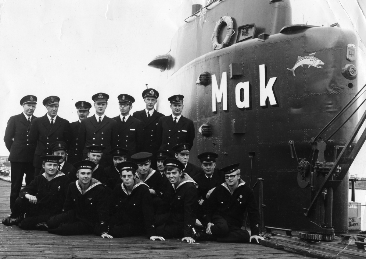Officerare och sjömän uppställda på kajen intill ubåten Makrillen.