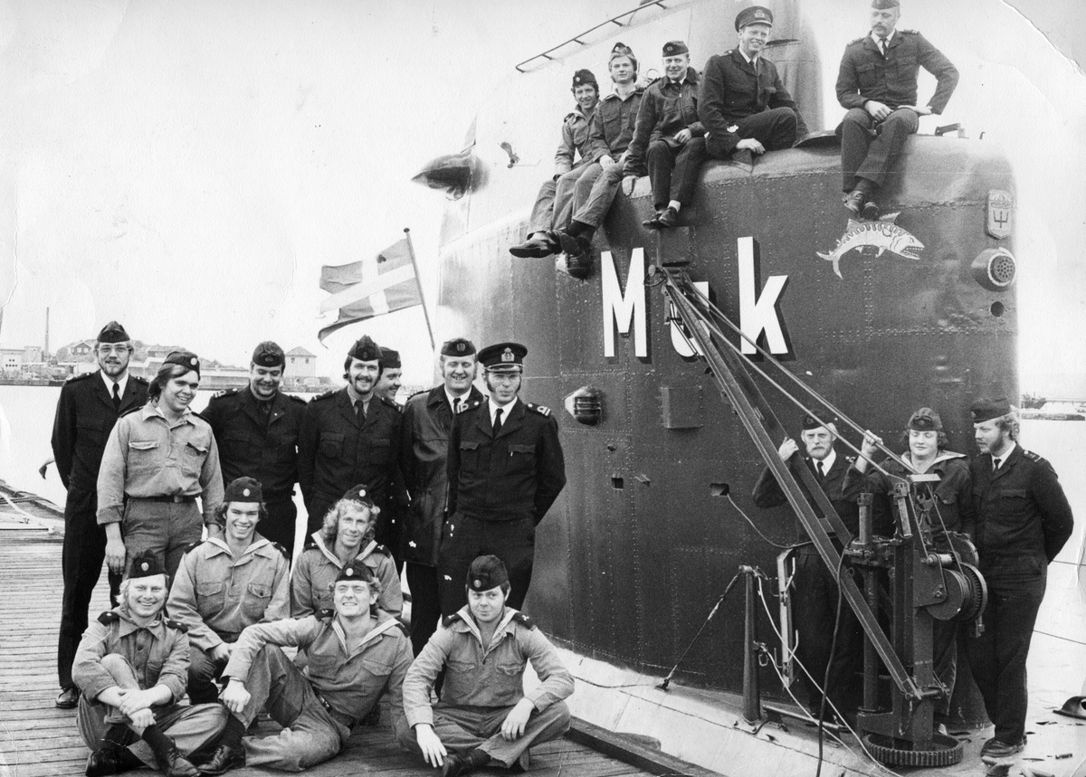 Officerare och sjömän uppställda på kajen och på ubåten Makrillen.