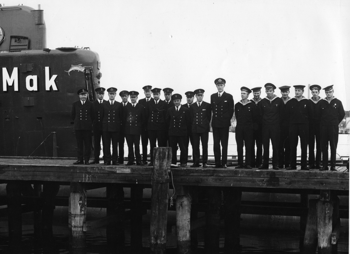 Officerare och sjömän uppställda på rad på kajen intill ubåten Makrillen.
