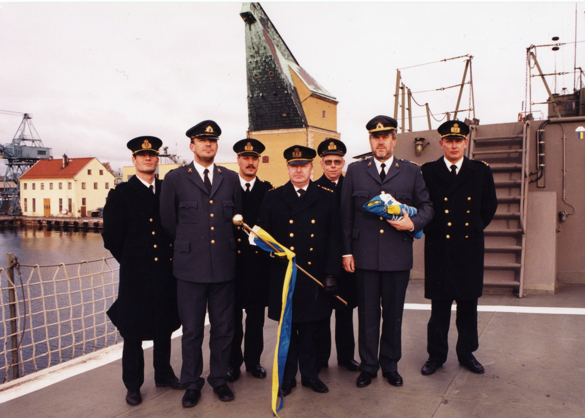 Officerare uppställda på däck. Gamla mastkranen på Karlskronavarvet i bakgrunden.