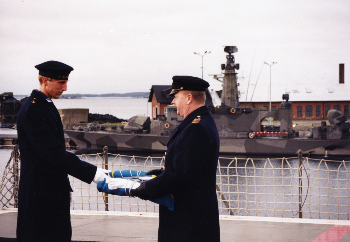 Titel: Halning av befälstecken och flagga. Bengt Pauli överräcker.