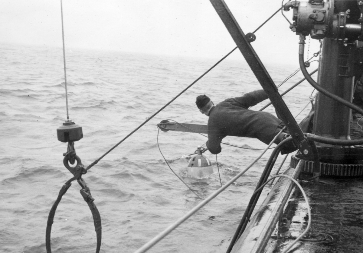 En sjöman hänger i en anordning vid sidan på en ubåt. Text i album "... torpedbärgning"