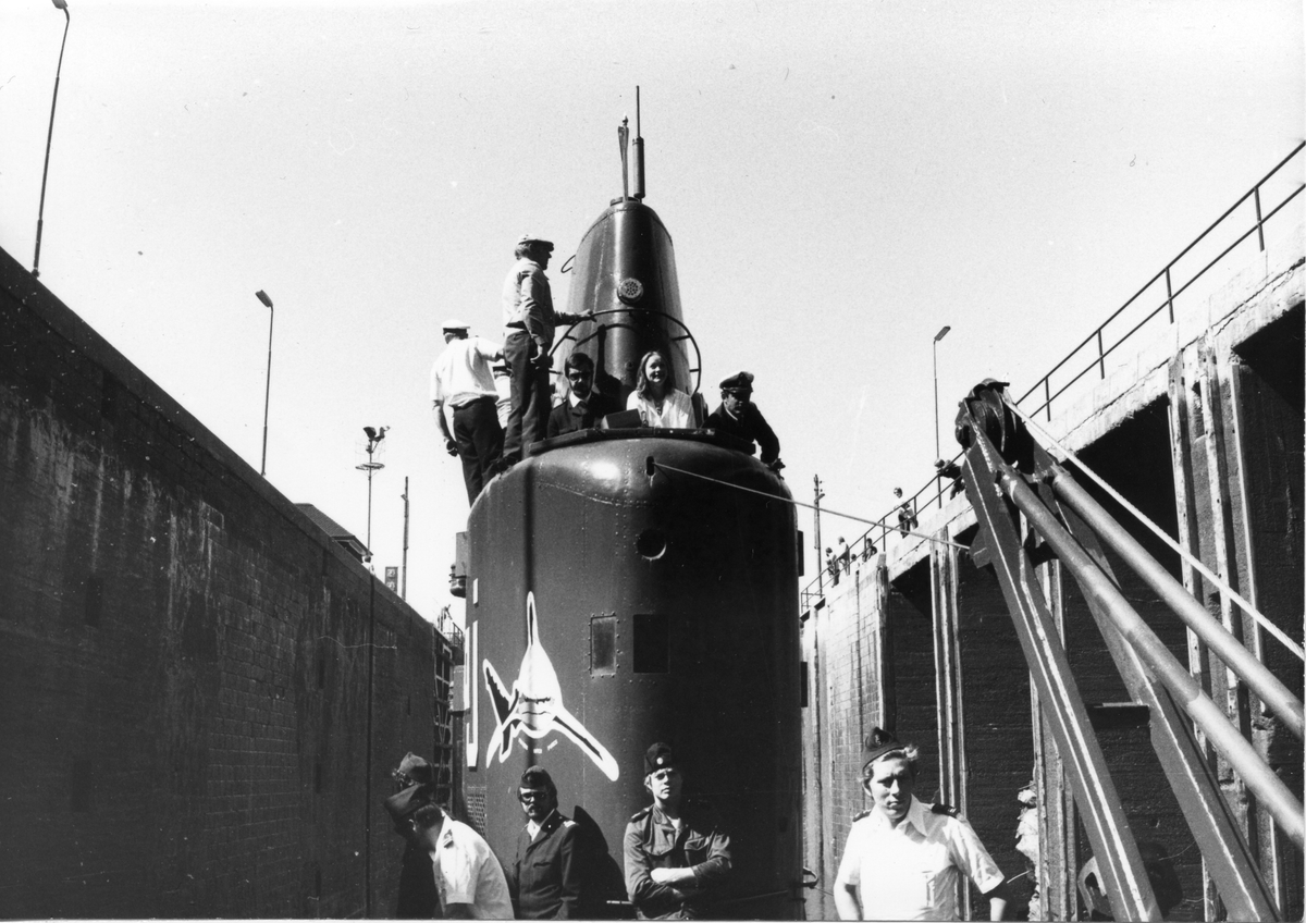 Titel: Ubåten Hajen är på väg upp till Vänern. Bilden visar ubåten i sluss 1975