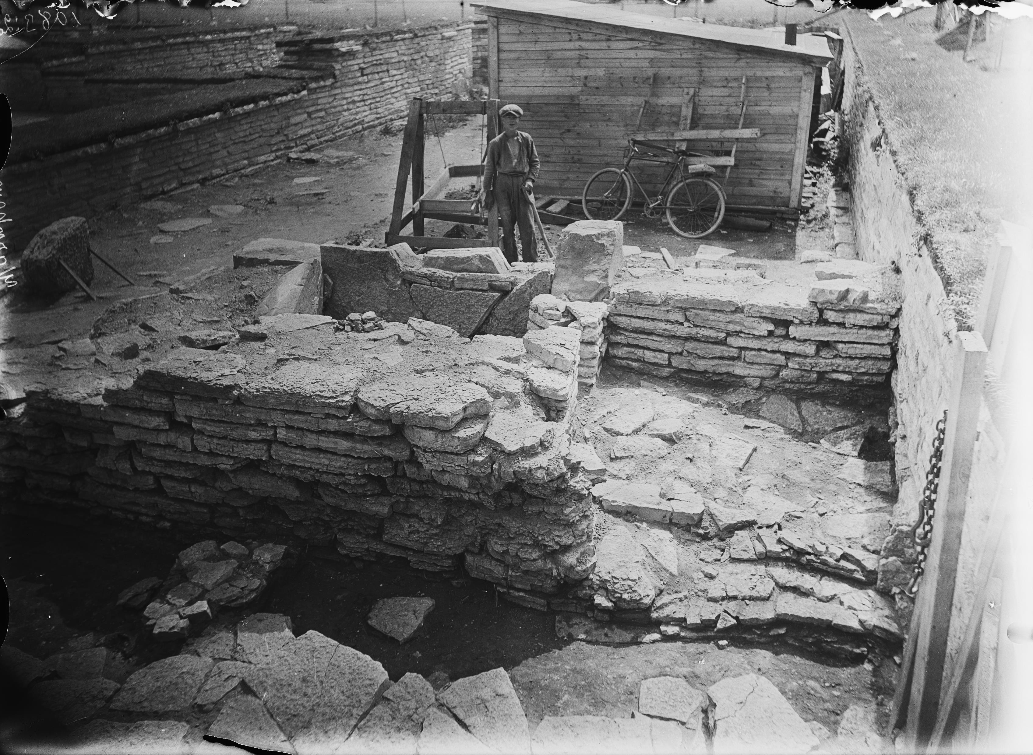 Västra förstugans södra mur och trappmurarna söder därom. Golvrester. Observera skarven mellan murarna till höger. Nedtill till höger syns rester av en stående dörrkarm av kalksten. Från norr.