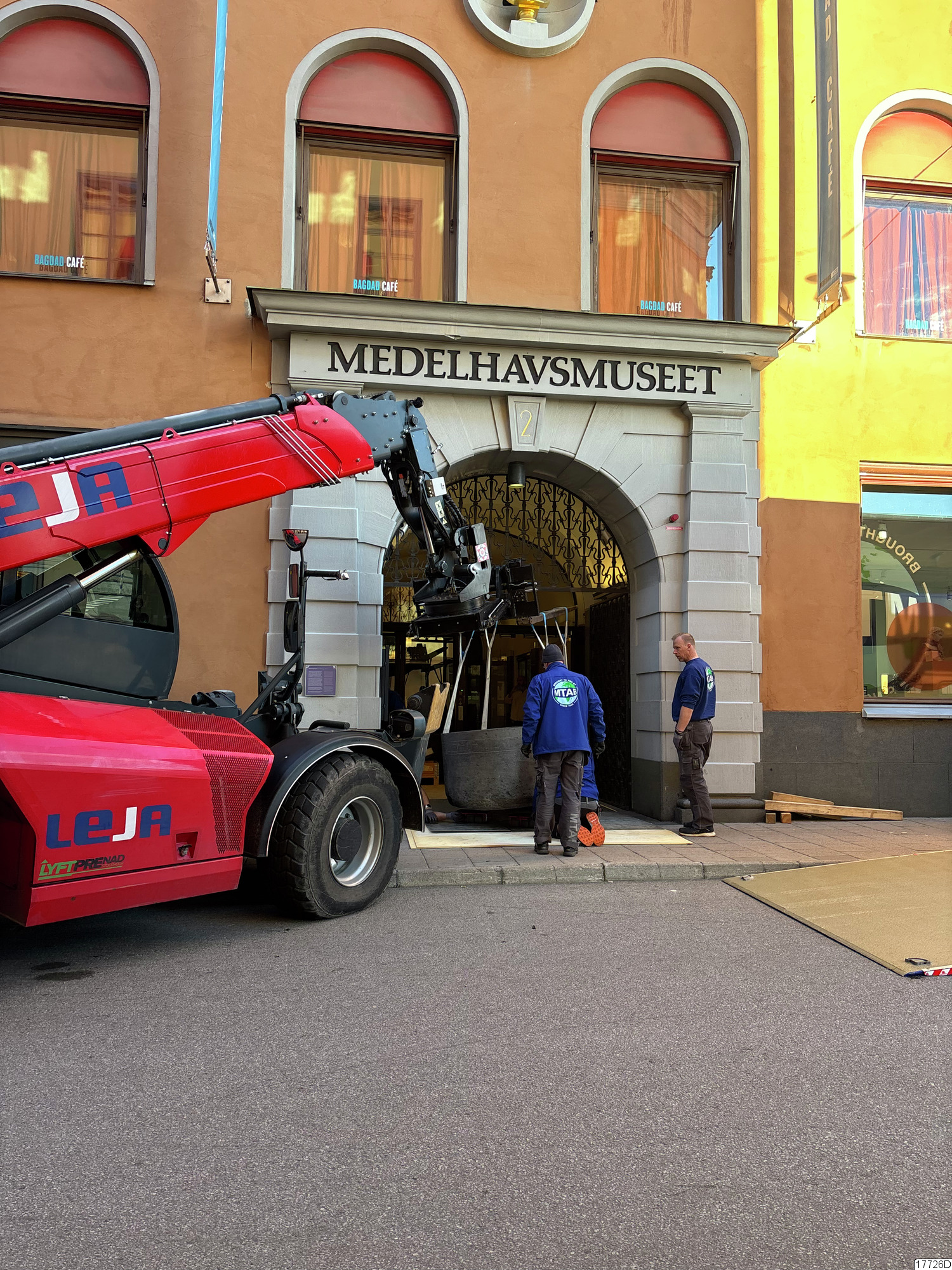 Beskrivning: Sarkofagen flyttar in till Medelhavsmuseet, underdelen, med hjälp av MTAB. Ovandelen (locket) har tidigare varit inne i museets Egyptenutställning.