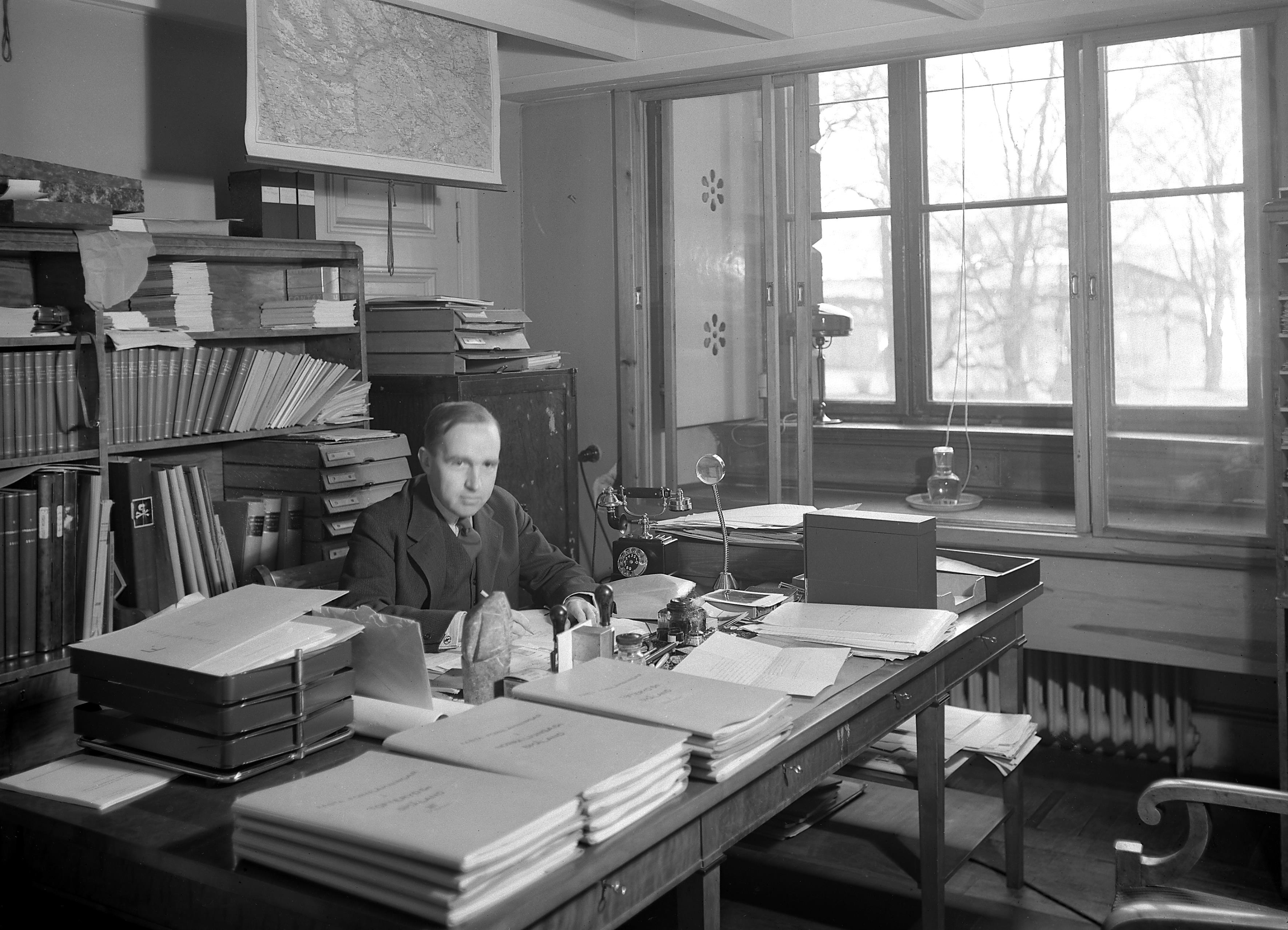 Karl Alfred Gustawsson i sitt tjänsterum i Nationalmuseets byggnad, där Historiska museets fornminnesavdelning inhystes. 1938 blev han chef för fornminnesavdelningen och 1955 utsågs han till överantikvarie.