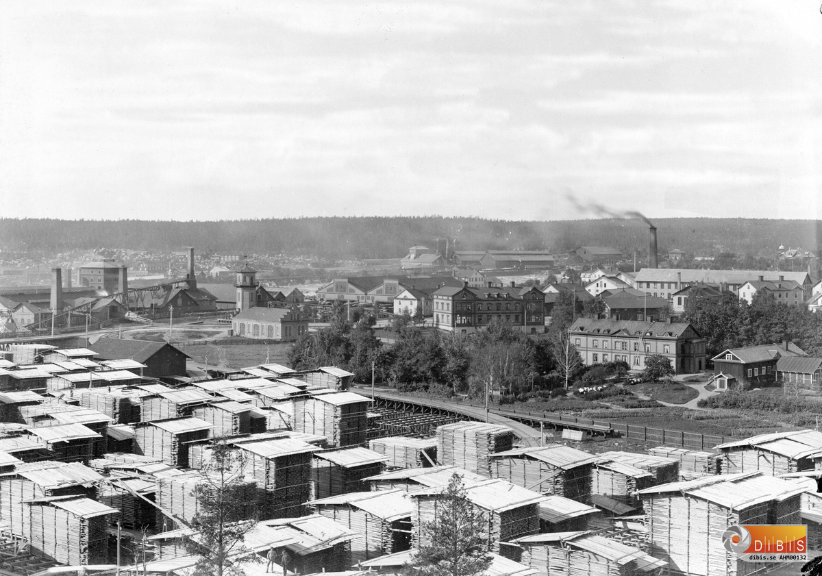 Från vänster; Brädgård, Järnverk, Brandstation, Sågverk, Hotell, Mekanisk verkstad, och allra längst till höger ett bostadshus som heter Kungsbacken.