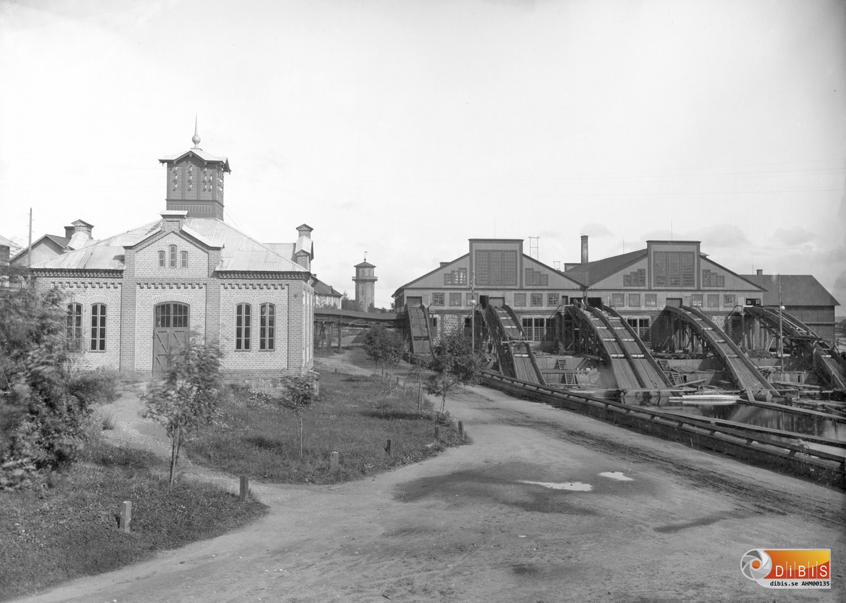 Lyshuset till vänster, ångsågen uppförd 1881, till höger, i bakgrunden, slangtornet på brandstation, Ljusne.