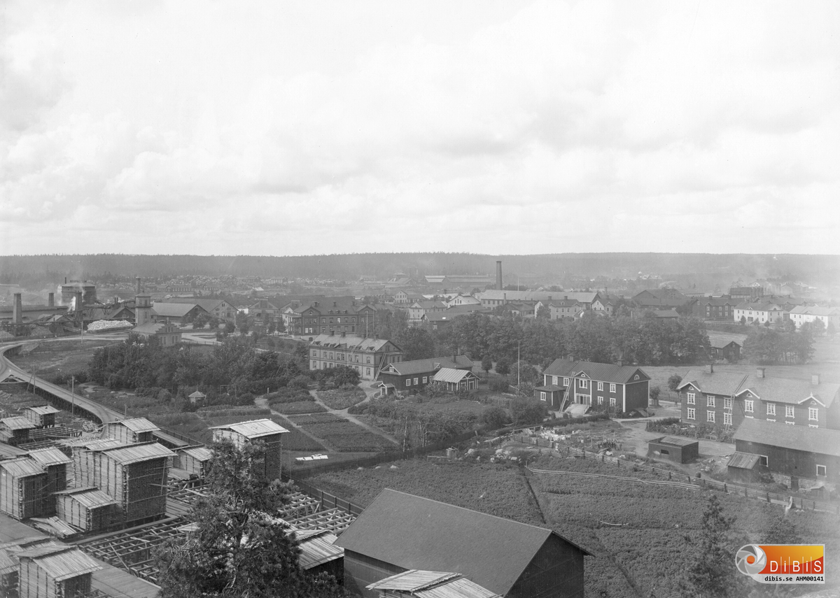 Brädgården och till höger arbetarbostäder med uthus efter Nygatan.