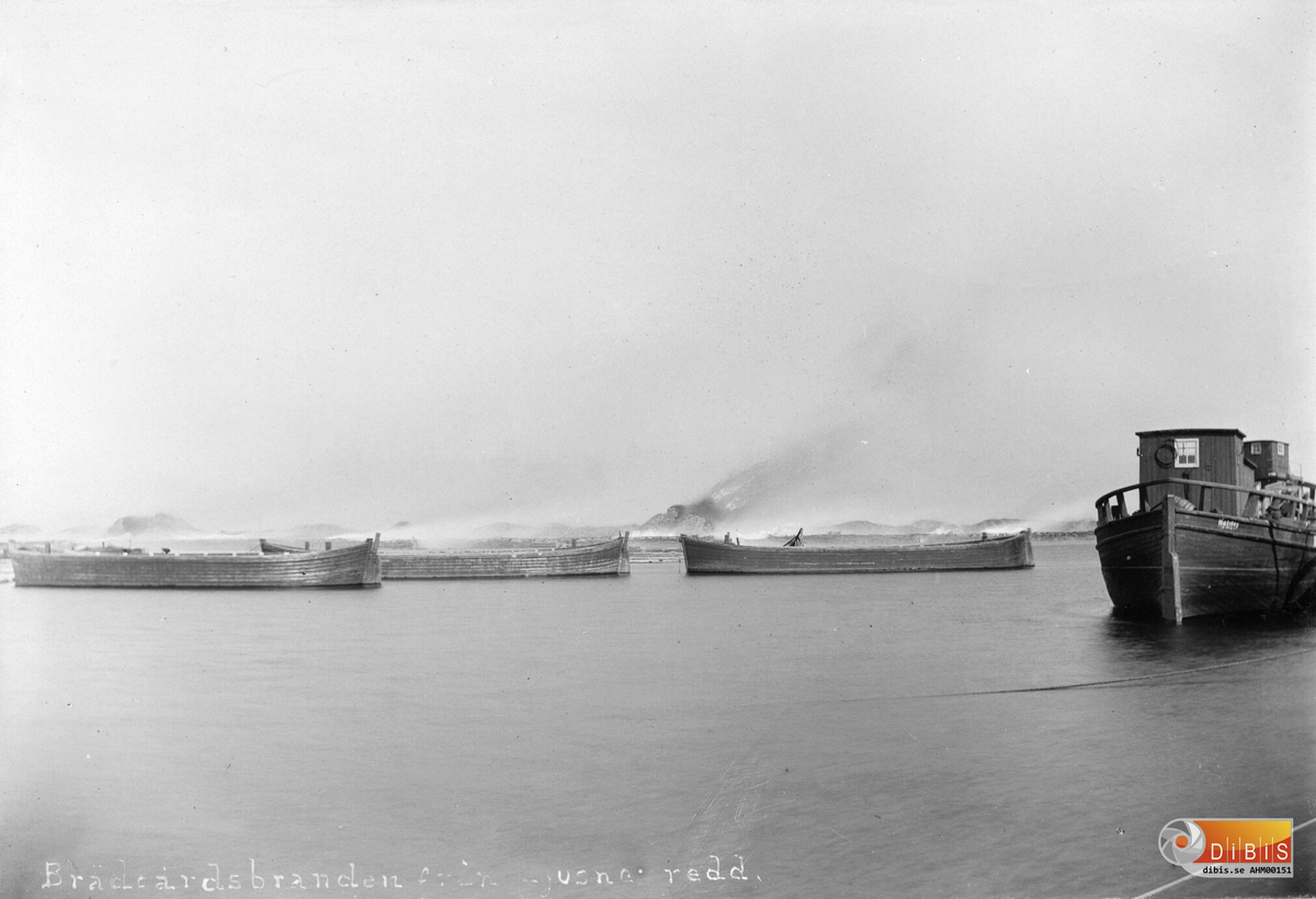 Pråmar i Ljusne och brandrök i bakgrunden från brädgårdsbranden