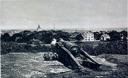 Kanonen på Gamla påskberget. Den stod tidigare på Varbergs fästning men såldes på offentlig auktion 1897 och flyttades senare samma år till denna plats, som därav började kallas "kanonberget". Trevåningshuset t h om kanonen är det sk "Thamska huset".