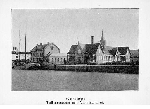"Warberg: Tullkammaren och Varmbadhuset". Bilden är tagen mot sydöst med tullhuset till vänster och bakom det ett vitt timrat lagerhus för spannmål. Det har kallats Lundqvists magasin (rivet 1978) och var sammanbyggt med hamnmagasinet från 1874, varifrån rian sticker upp.