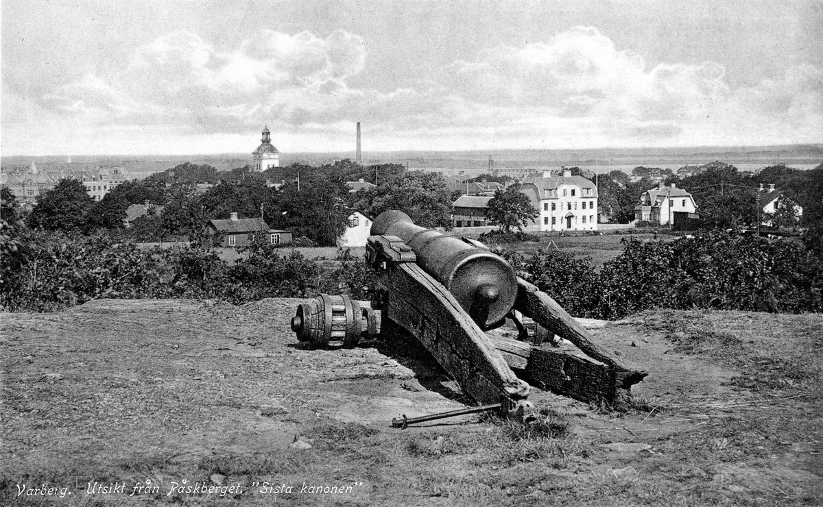 Vykort, "Varberg. Utsikt från Påskberget. 'Sista kanonen'" Vy över staden mot väster med fästningens sista kanon i förgrunden, som år 1897 placerades här efter att ha sålts på offentlig auktion tidigare samma år. Köpare var skeppsmäklare Gustaf Magnusson som sedan tillsammans med färgaren J V Lindqvist, järnhandlare Hartvig Bolander, bagaremästare Victor Persson, garverifabrikör Valdemar Holmberg samt handlanden C M Lindström skänkte kanonen till Varbergs stads plantering. Det stora vita huset till höger om kanonen är det s k Thamska huset.