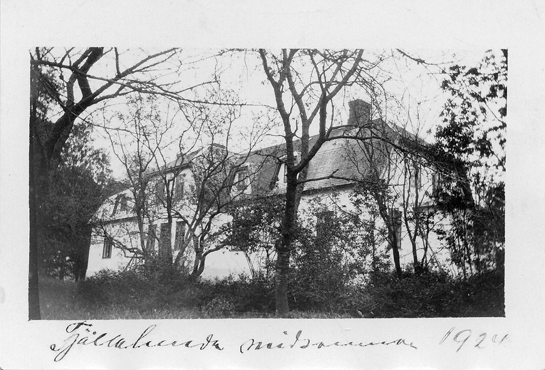 "Fjällalunda midsommar 1924". Gamla Fjällalundas manbyggnad som uppfördes 1808 men byggdes om just 1924. Samma år hade landstingsman Ernst Stener köpt gården, som hade legat under Sannarps gods till 1918. Ekonomibyggnader uppfördes 1920-30 och arbetarbostäder 1935-45. Bilden visar en vitputsad mangårdsbyggnad med valmat mansardtak. I förgrunden späda träd och buskar.