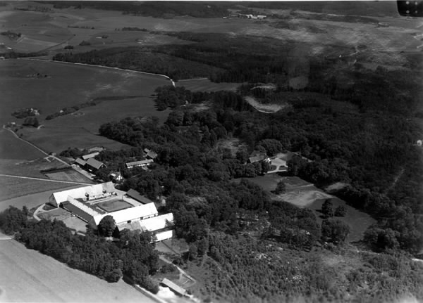 Exteriörbild. Flygbild. Sannarps herrgård, som har rötter i medeltiden. Mangårdsbyggnader och ekonomibyggnader. Skog och odlingslandskap.