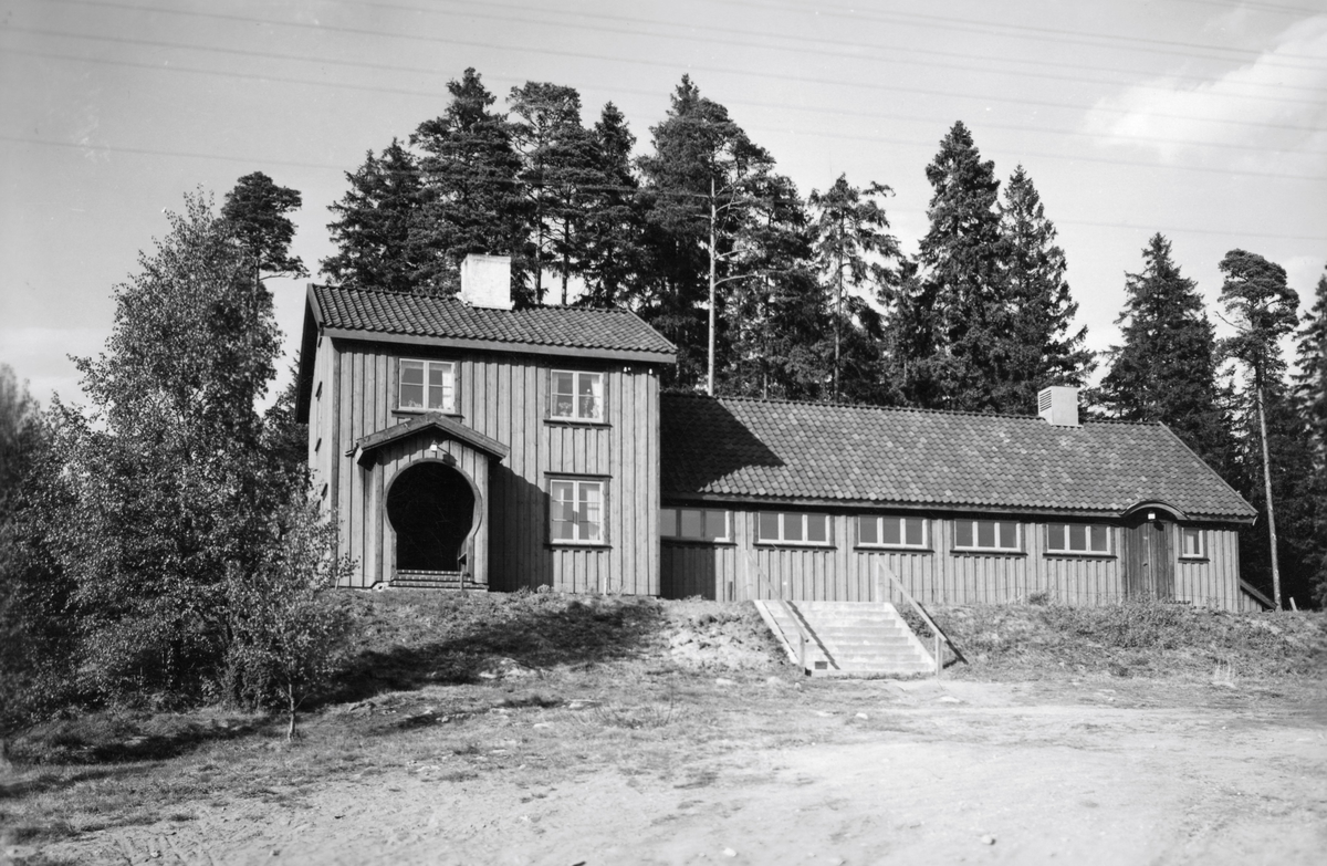 Fagereds hembygdsgård framför en barrträdsdunge. Gården består av en tvåvåningsbyggnad med "skånke", dvs en tresidig farstukvist med stor nyckelhålsformad öppning, sammanbyggd med en långsträckt envåningslänga. En bred trappa i slänten leder upp till avsatsen där byggnaden ligger. Text till bilden: "Hembygdsgården Fagered. Fageredsaffären". Bild 2 visar bilden som vykort.